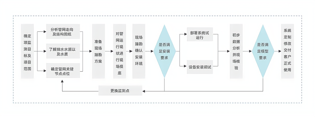 解决方案遵循“科学规划—精准部署—数据融合—智能应用—持续优化”的全周期落地流程,兼顾工程效率与民生影响:第一步,开展管网现状排查工作,重点梳理老旧管网、民生密集区域管网情况,结合政策要求与管理需求,科学规划监测点位布局;第二步,部署智能监测设备与边缘计算终端,采用微创安装方式,减少对居民出行与生活环境的干扰,实现数据本地预处理与稳定传输,适配老旧城区等复杂安装环境;第三步,搭建一体化监测平台,整合管网、泵站、排水户等多源数据,建立统一数据标准,打破信息壁垒,提升跨环节协同效率;第四步,上线智能预警、工单派发、调度管控等功能模块,实现风险处置全流程闭环管理,缩短民生相关排水问题的处置周期;第五步,基于监测数据与运行成效,持续优化监测点位与模型参数,动态提升管理效能,为老旧管网改造、防汛防涝民生工程提供数据支撑。