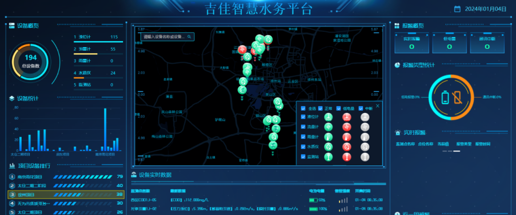 2. 城区民生密集区智慧水务平台应用:整合城区670公里雨污水管网信息,重点在居民小区、商业街区等区域部署160套监测设备、134个液位计及8处内涝积水在线监测站,构建全方位监测系统。在2024年多次暴雨天气中,通过平台精准调度处置,优先保障居民区、学校等重点区域排水畅通,实现雨后半小时内城区民生区域积水全部排净,未发生严重积水问题,显著提升了城市防洪排涝能力与民生保障水平。