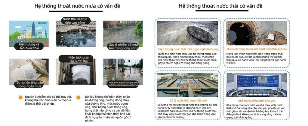 - Quản lý phân mảnh: Dữ liệu mạng lưới, trạm bơm, nhà máy xử lý nước thải tách rời, thiếu điều phối thống nhất, khó hình thành hiệu quả quản lý tổng thể.