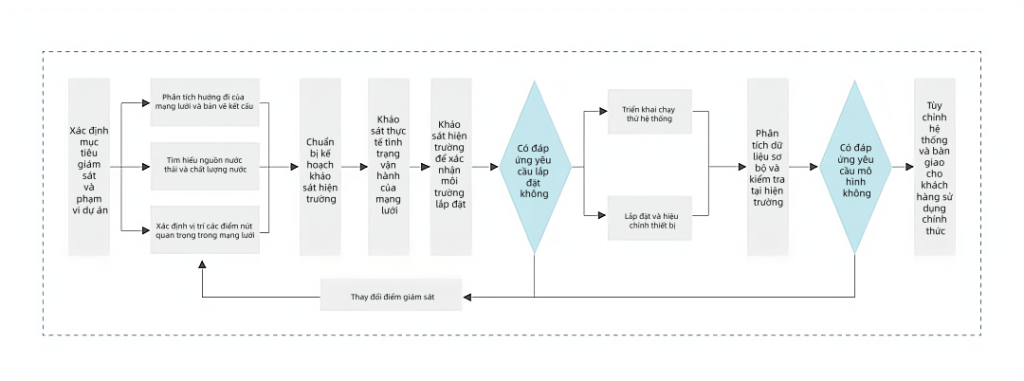 - Bước 1: Tiến hành khảo sát hiện trạng mạng lưới, tập trung rà soát các mạng lưới cũ, khu vực dân cư đông đúc, kết hợp yêu cầu chính sách và nhu cầu quản lý, lập kế hoạch khoa học bố trí các điểm giám sát.